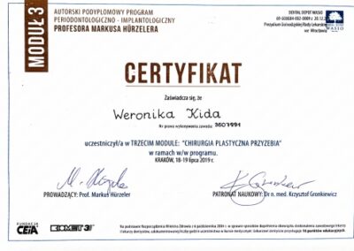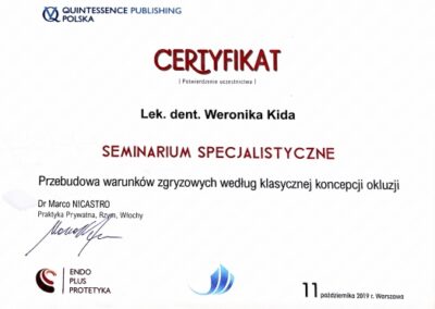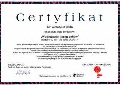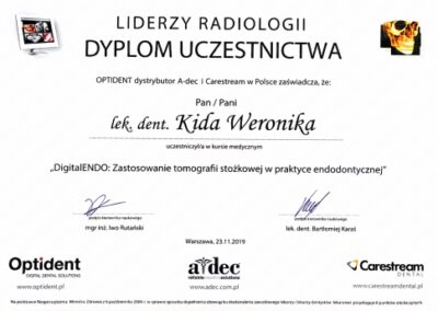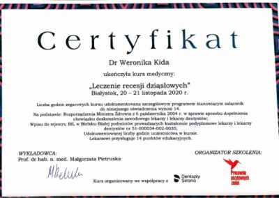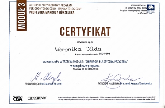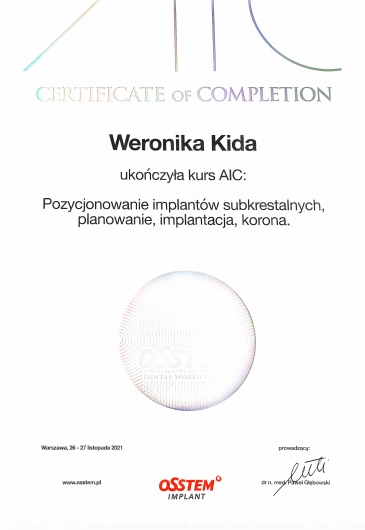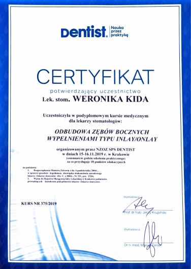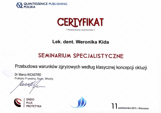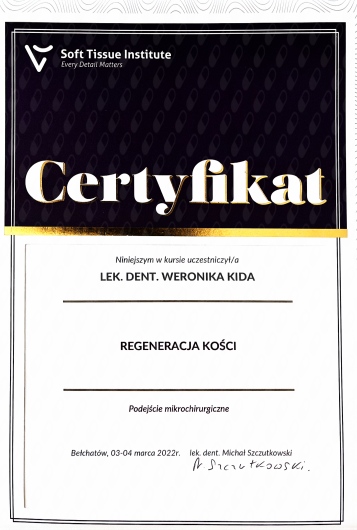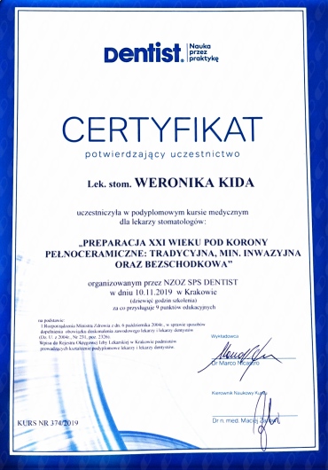 Uczestniczy w certyfikowanych kursach i szkoleniach, aby stale poszerzać swoją wiedzę i umiejętności. Podczas wykonywanych zabiegów wykorzystuje nowoczesny sprzęt taki jak mikroskop stomatologiczny, ultradźwięki.
