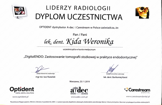 Specjalizuje się w trudnych przypadkach endodontycznych, tj. zobliterowanych kanałach, usuwaniu złamanych narzędzi kanałowych, zamykaniu perforacji oraz leczeniem Pacjentów w narkozie.